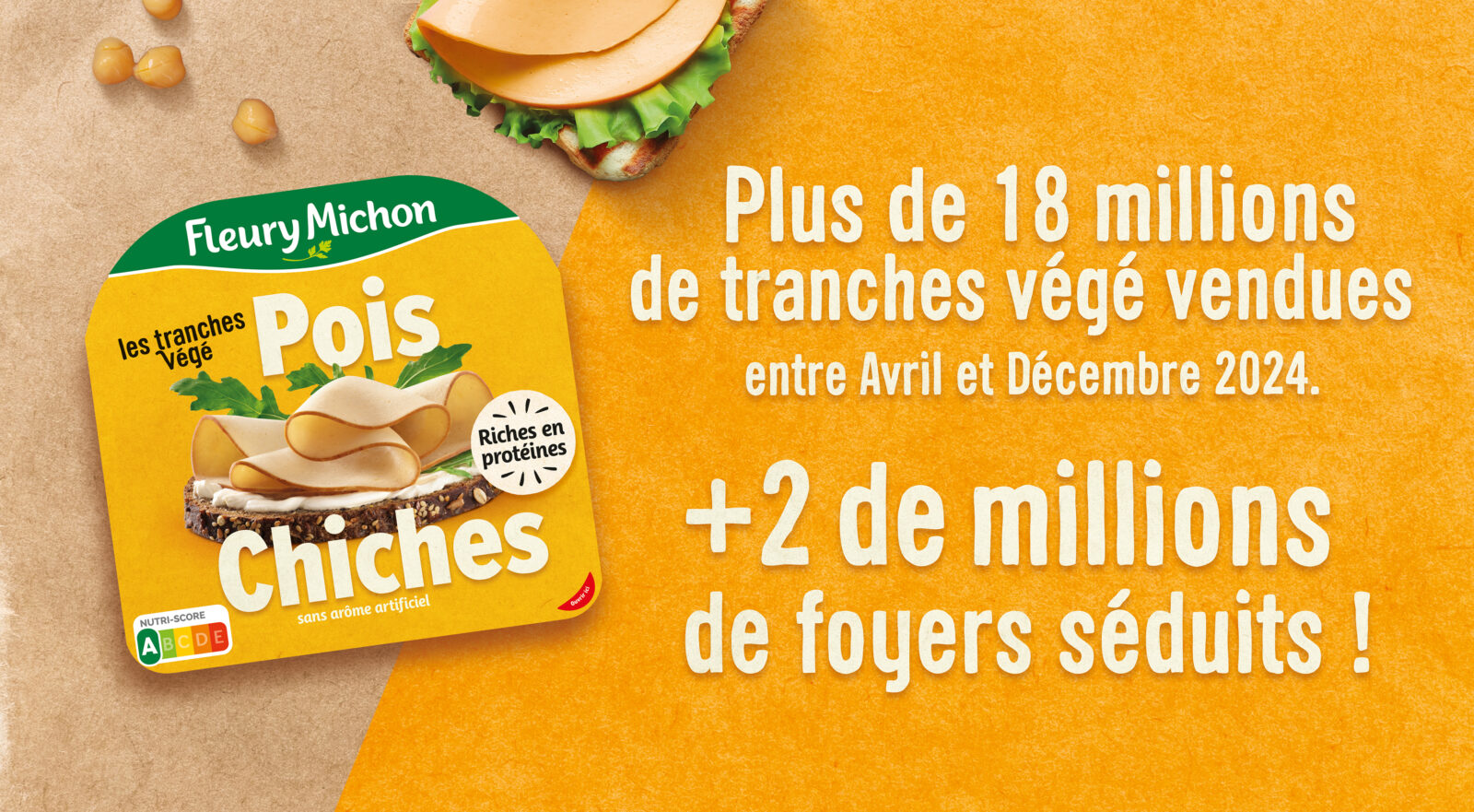 Un des meilleurs lancements de 2024 avec 18 millions* de tranches végé vendues d’avril à décembre 2024, soit plus de 1,5M de foyers séduits (Kantar), et à la clé la position de leader de la charcuterie végétale avec 69,5% du marché (Circana Total France FY 2024).