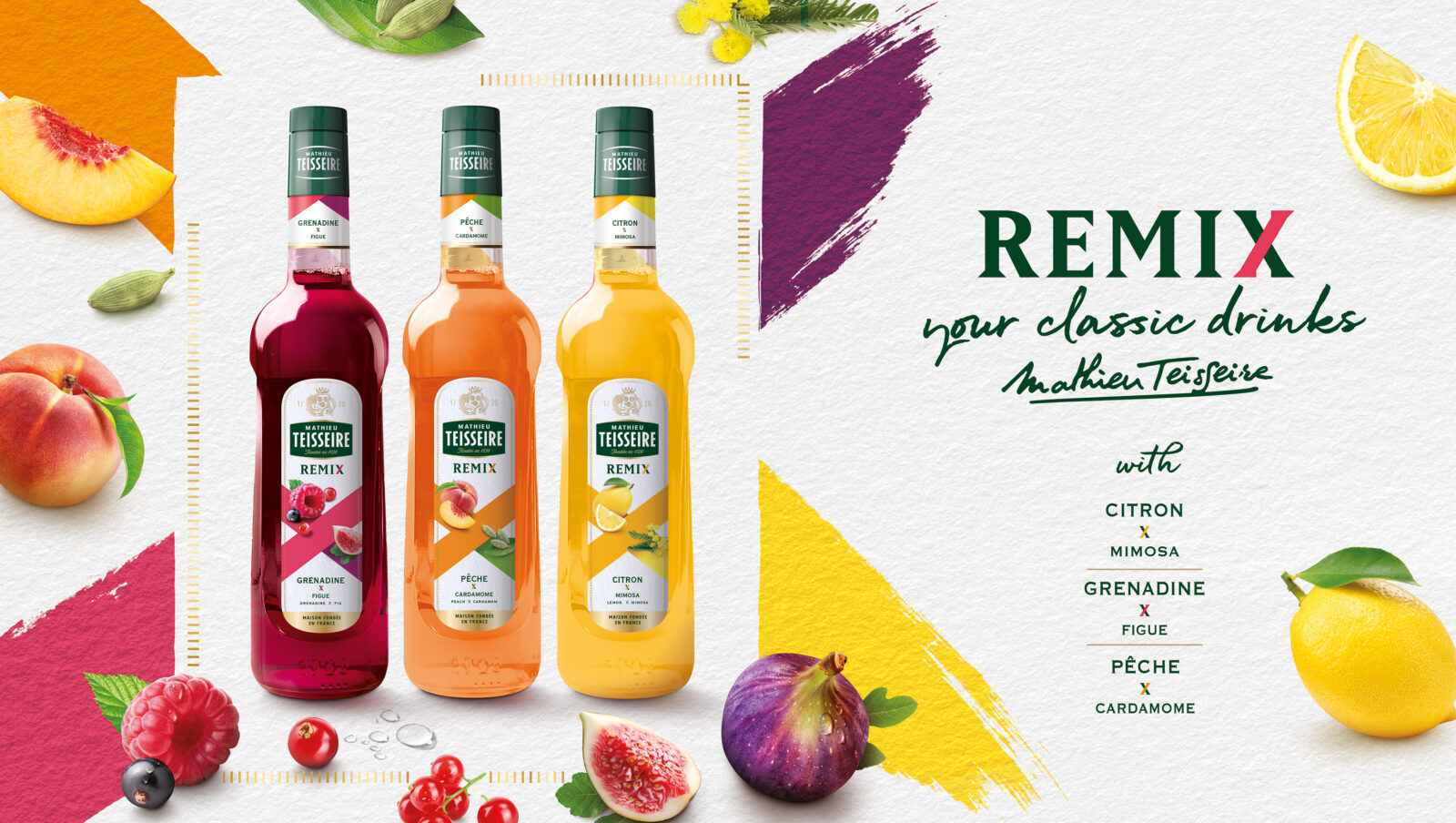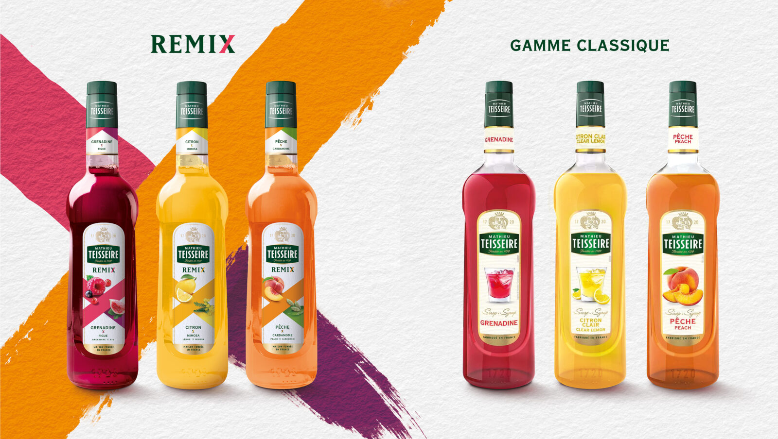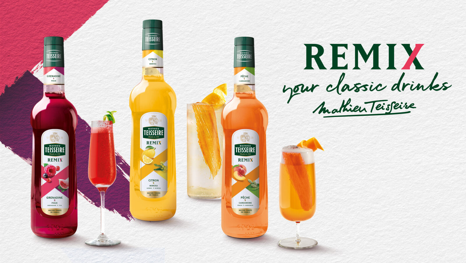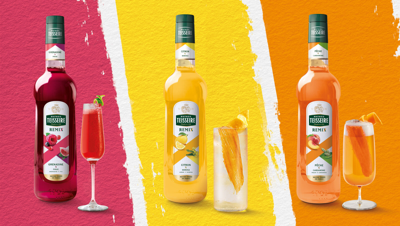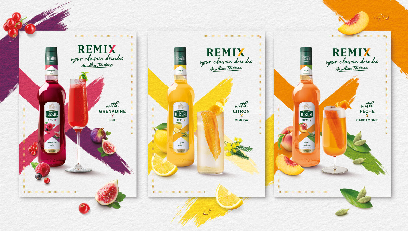 Soucieux de trouver le juste équilibre entre la familiarité des « best », et l’originalité de leur réinvention, nous avons travaillé autour du concept de « Remix » : la relecture des sirops iconiques de la marque, dans une gamme à la personnalité affirmée. Grenadine & Figue, Pêche & Cardamome, Citron & Mimosa. Une sophistication accessible, pour inspirer aux bartenders des relectures créatives de leur carte de boissons.